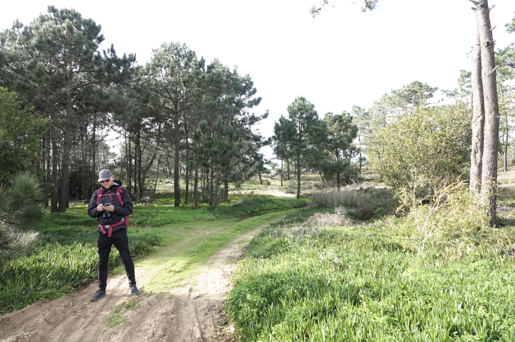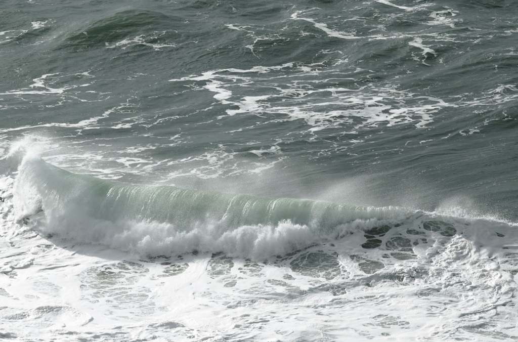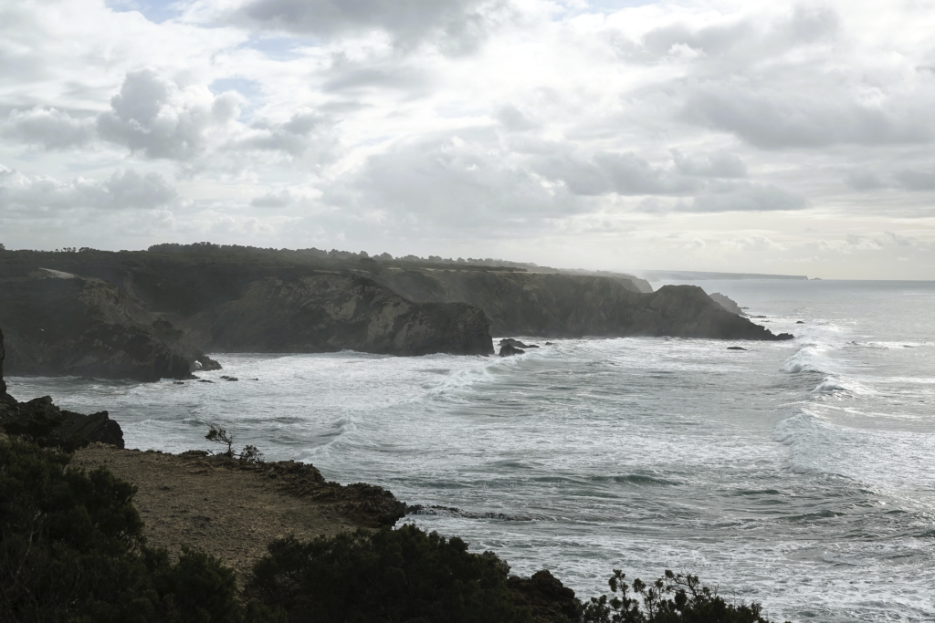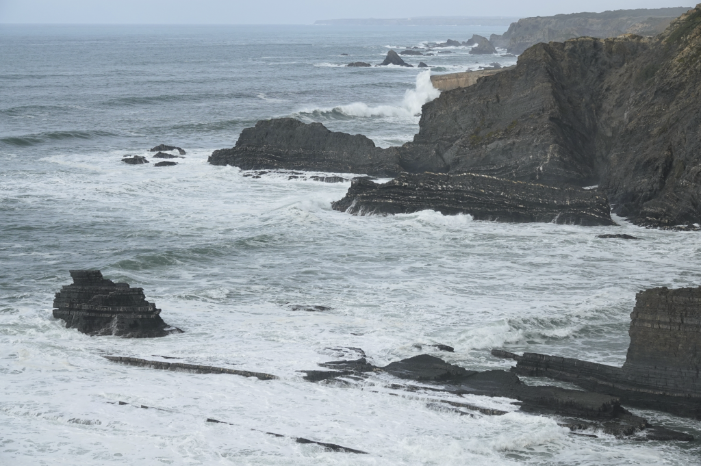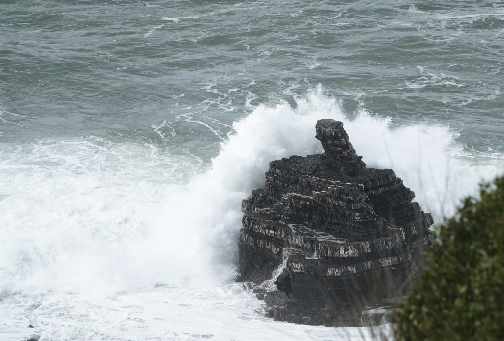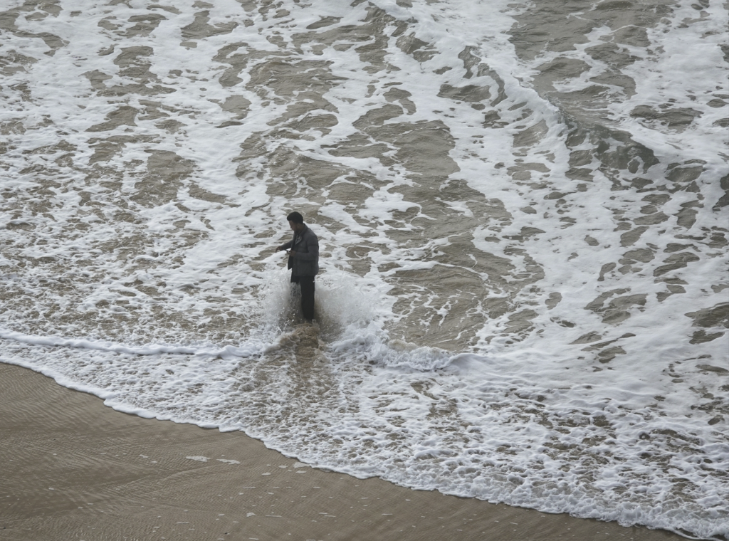 Weer prachtig uitzicht, beukende en spetterende golven, leuke vogels en voor de lach op ons gezicht een man die beneden op het strand druk aan het bellen was en de golf pas door had toen hij tot boven zijn knieën nat was.