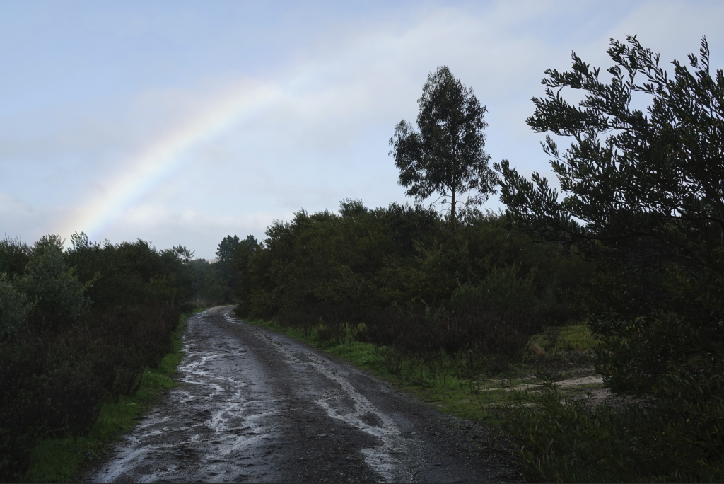 Gisteren werden we gewaarschuwd door Heike (eigenaar van het huisje) dat het slecht weer ging worden vandaag. Er werd gewaarschuwd om niet de bergen in te gaan vanwege hagel en sneeuw. Michel had een lange loop (17 km) op de planning staan. De weersvoorspellingen waren slecht, maar tussen 9.30-12 uur zou het waarschijnlijk droog zijn. Vannacht was het weer slecht: harde storm, onweer en regen. Michel ging er om 9.30 uur van uit dat het droog zou worden en ging op pad. Geen korte broek dit keer, wel handschoenen en regenjas. Ik besloot om 10 uur om te gaan wandelen en fotograferen, het was eindelijk droog. Dat duurde niet lang, maar ik genoot van het wandelen berg op en weer af, kijkend naar alle waterstromen her en der, het weinig pad wat er nog over was raakte steeds meer uitgesleten en het weer veranderde bijna per minuut. Het ene moment een bui op mijn hoofd en twee tellen later zon en een regenboog. Michel was voor 12 uur weer thuis en had geen regen gehad, wel hagel/sneeuw langs de weg en koud!