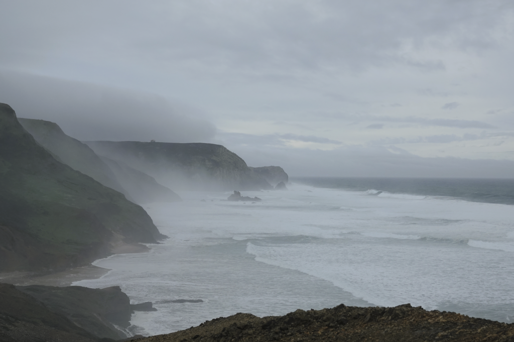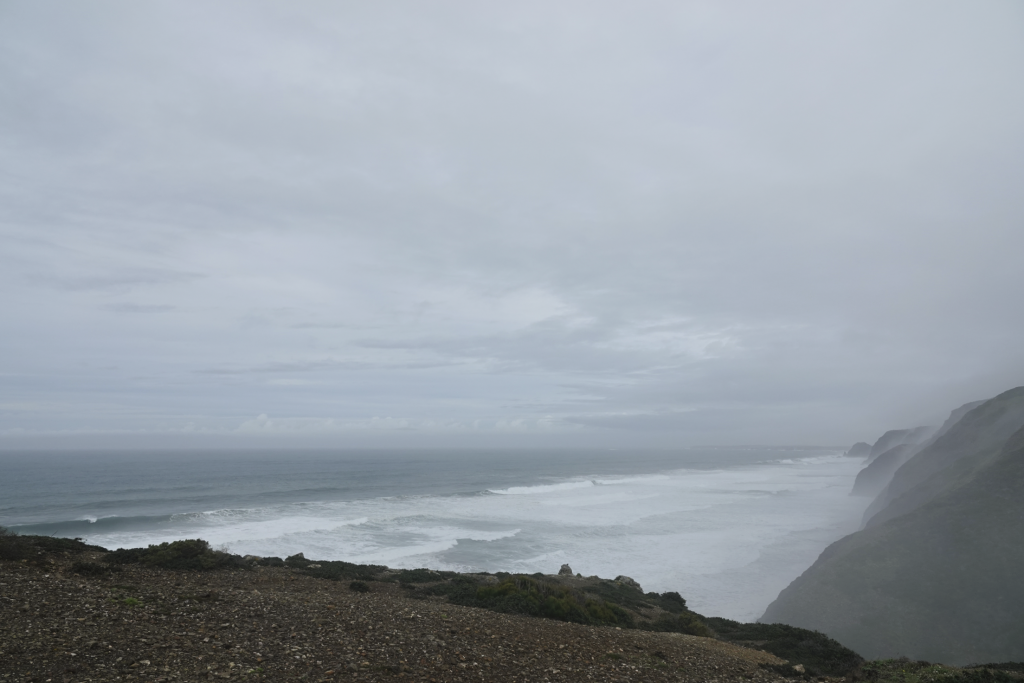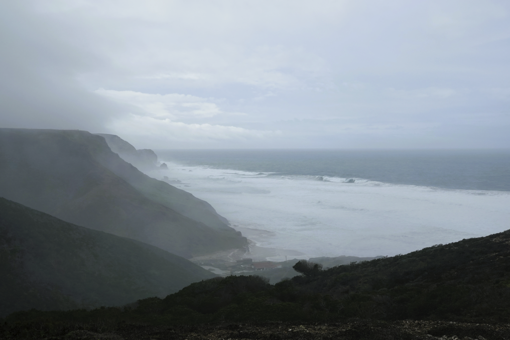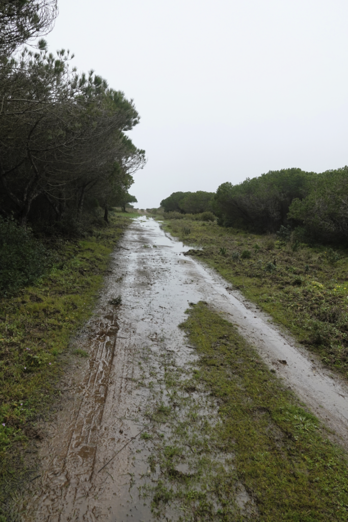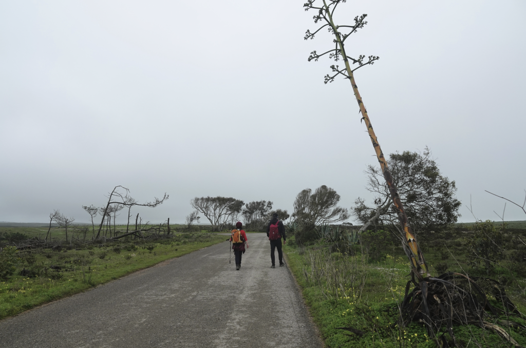 Ja, het is weer nat, nee mijn schoenen zijn nog niet droog, ja we gaan toch wandelen. Een klein uurtje rijden naar Vila do Bispo voor een wandeling van ongeveer 12 km richting zee. Het is kleddernat, zowel vanuit de lucht als op de grond. Maar we hebben er zin in. Vanuit het dorpje wandelen we richting zee. Onderweg komen we Helga tegen, die zou the fishermans trail lopen, maar door het slechte weer lukt dat niet. Delen zijn onbegaanbaar en gevaarlijk. Ze vraagt waar wij naar onderweg zijn. Naar zee dus! Helga twijfelt en wij gaan door. Later merken wij dat ze ons toch volgt. Ze geeft later aan dat ze daar onderweg wel spijt van had. Zo veel water, zo’n diepe plassen en over de keien omhoog kost energie en vergt veel concentratie. Als we stoppen om te eten is Helga bij ons. Ze vraagt of wij het everzwijn langs de weg ook hebben gezien. Niet dus… Hoe dat kan? Druk met concentreren met omhoog lopen en proberen niet te vallen. Alleen blik op de weg dus… En dat terwijl ik zo graag een everzwijn wil fotograferen. Sporen zien we wel, maar het grote everzwijn (ook dat nog) niet. We zijn het gewoon voorbij gelopen.