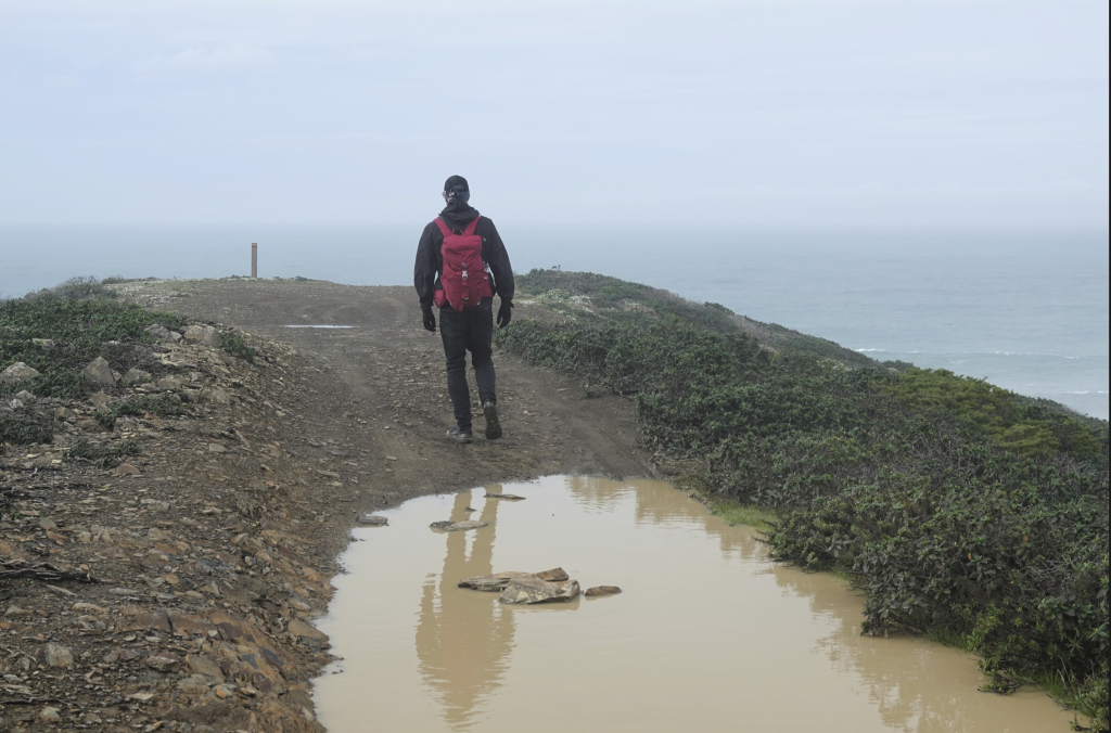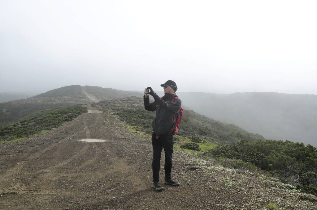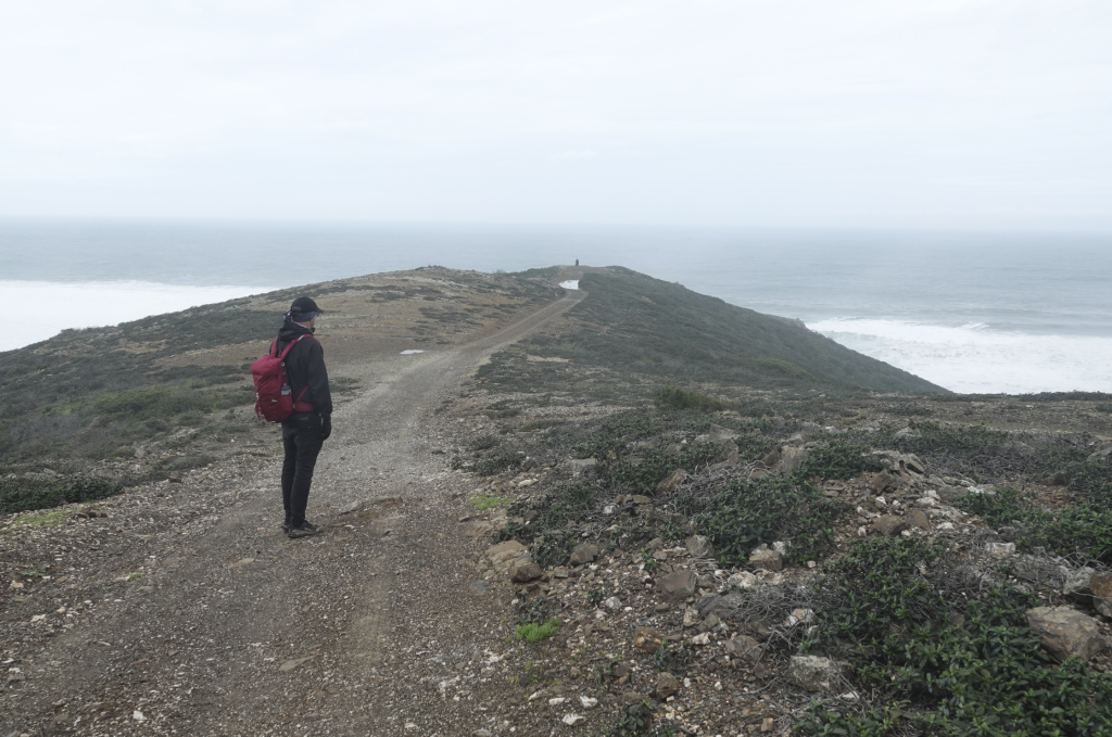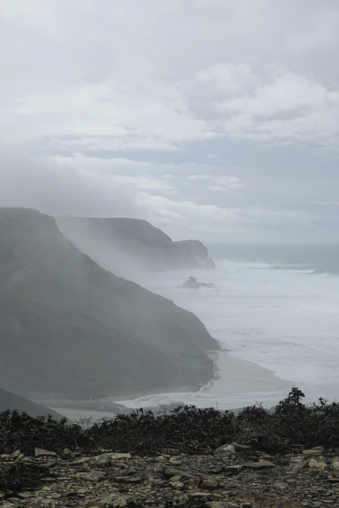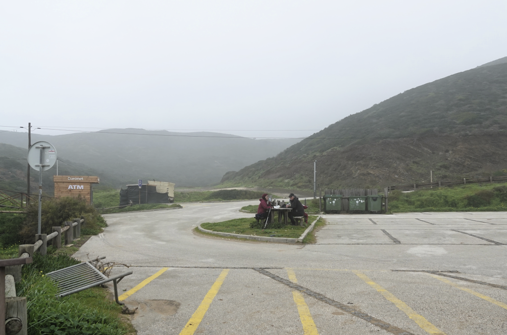 Ja, het is weer nat, nee mijn schoenen zijn nog niet droog, ja we gaan toch wandelen. Een klein uurtje rijden naar Vila do Bispo voor een wandeling van ongeveer 12 km richting zee. Het is kleddernat, zowel vanuit de lucht als op de grond. Maar we hebben er zin in. Vanuit het dorpje wandelen we richting zee. Onderweg komen we Helga tegen, die zou the fishermans trail lopen, maar door het slechte weer lukt dat niet. Delen zijn onbegaanbaar en gevaarlijk. Ze vraagt waar wij naar onderweg zijn. Naar zee dus! Helga twijfelt en wij gaan door. Later merken wij dat ze ons toch volgt. Ze geeft later aan dat ze daar onderweg wel spijt van had. Zo veel water, zo’n diepe plassen en over de keien omhoog kost energie en vergt veel concentratie. Als we stoppen om te eten is Helga bij ons. Ze vraagt of wij het everzwijn langs de weg ook hebben gezien. Niet dus… Hoe dat kan? Druk met concentreren met omhoog lopen en proberen niet te vallen. Alleen blik op de weg dus… En dat terwijl ik zo graag een everzwijn wil fotograferen. Sporen zien we wel, maar het grote everzwijn (ook dat nog) niet. We zijn het gewoon voorbij gelopen.