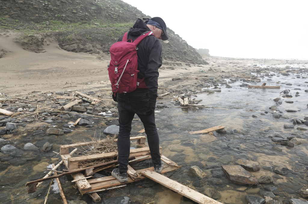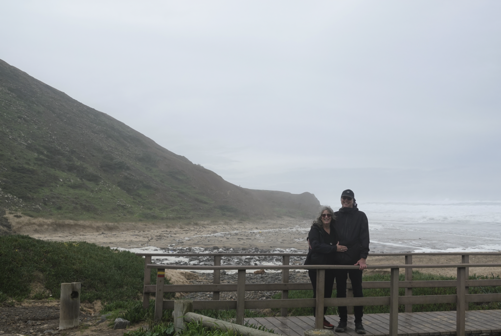 Na het lunchen gaan we weer op pad. We moeten de rivier, die de zee in stroomt, over om bij ons pad te komen. Er ligt genoeg hout langs de rivier om een brug naar de overkant te maken en onze schoenen zijn al nat. Met veel gelach bereiken we, nog natter, de overkant. Eenmaal daar komt er toch opeens een hoge schuimgolf aan. We gillen en rennen en daarna hoor ik Michel niet meer en zie hem ook niet. Gelukkig duurde dat niet lang. We kunnen niet naar het andere pad, te gevaarlijk! Maar “onze brug” is verdwenen onder het schuim. We moeten verderop door het water terug. Het stuk terug naar de auto lopen we over de weg, samen met Helga.