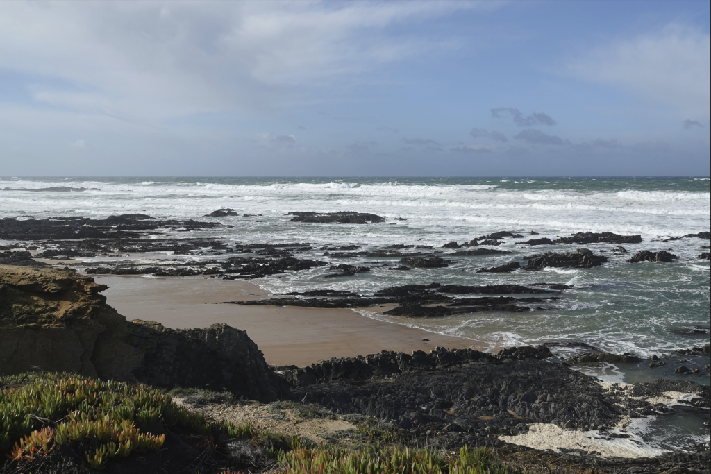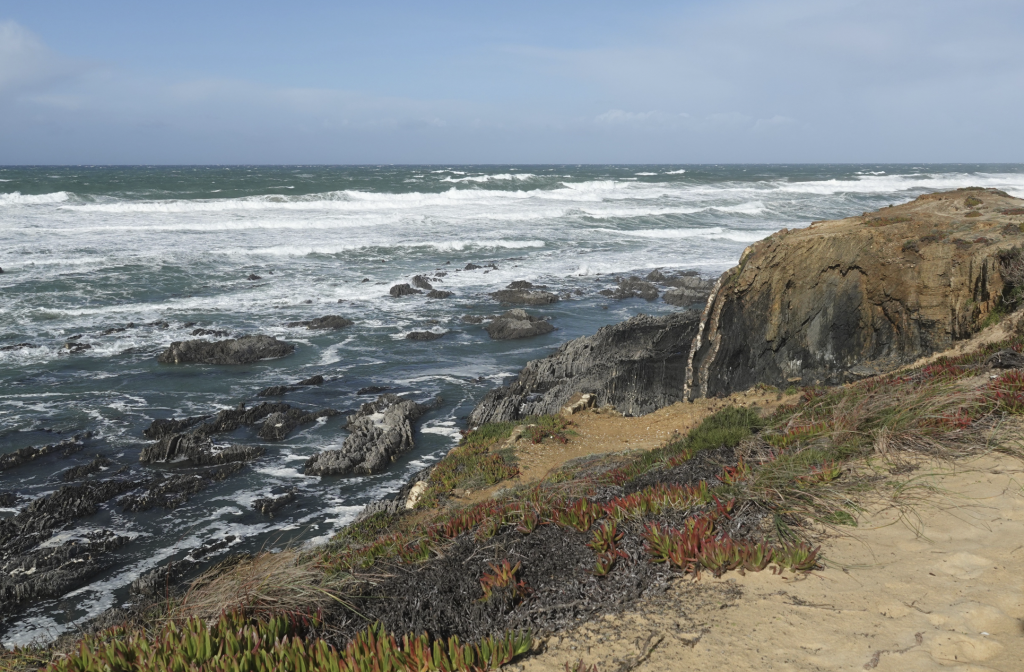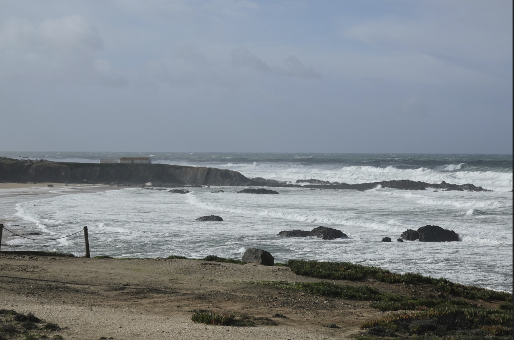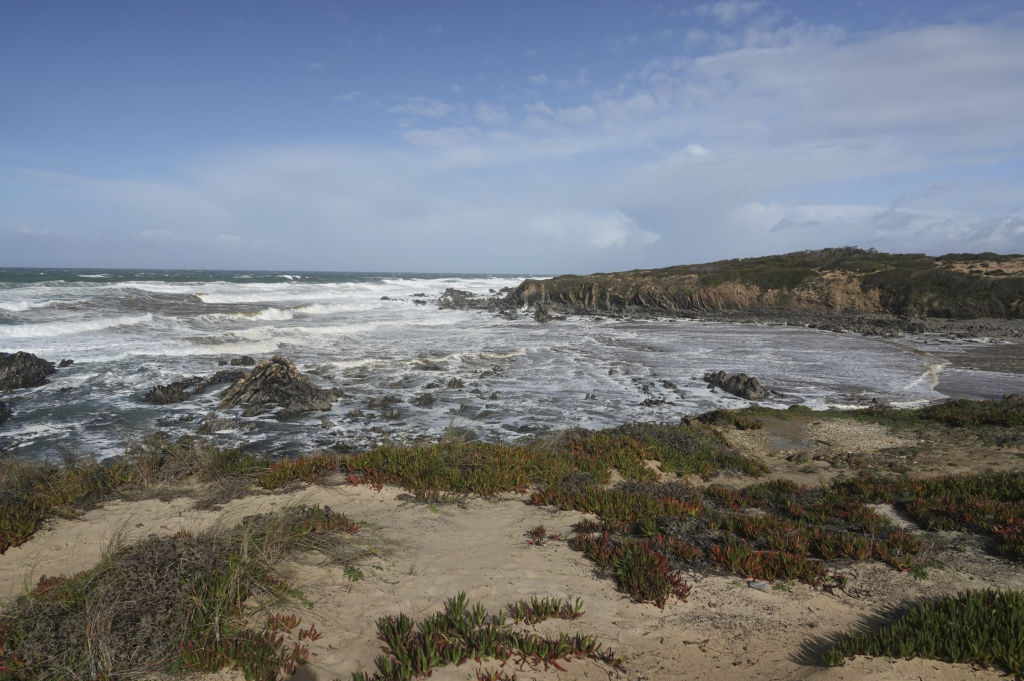 Zondag was een binnenblijfdag. Maandag dus zeker niet. Er was een droog uurtje voorspeld, dus daar gingen we voor. In de regen naar Almograve en toen we daar kwamen was het droog met af en toe een paar spetters. De wandeling die we wilden lopen lukte niet vanwege… teveel water en stroming over het pad. Op de klif aan de overkant keerden lopers van the fishermans trail weer terug. Iedere dag wordt het slechter en natter.