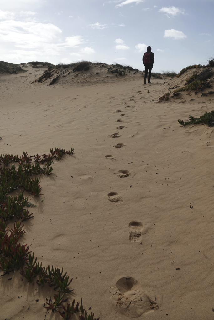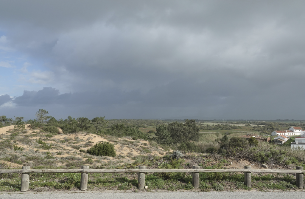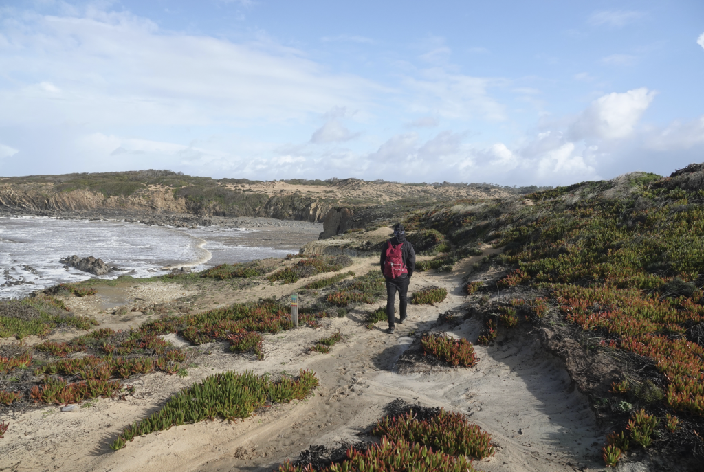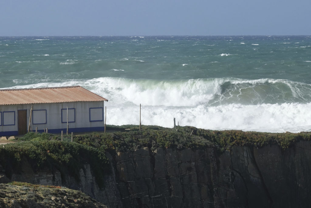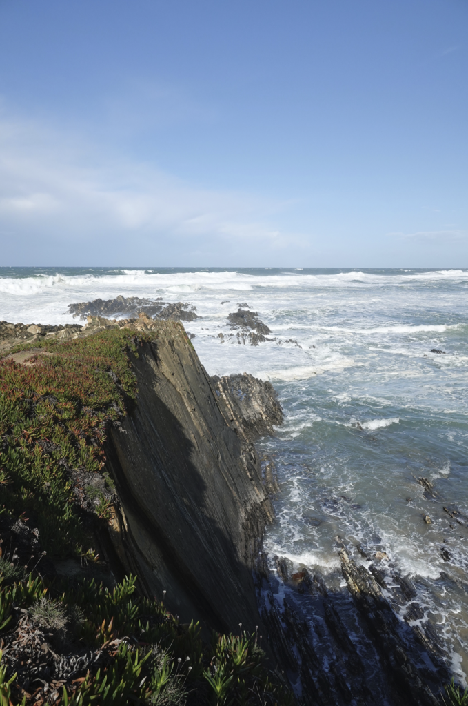 Zondag was een binnenblijfdag. Maandag dus zeker niet. Er was een droog uurtje voorspeld, dus daar gingen we voor. In de regen naar Almograve en toen we daar kwamen was het droog met af en toe een paar spetters. De wandeling die we wilden lopen lukte niet vanwege… teveel water en stroming over het pad. Op de klif aan de overkant keerden lopers van the fishermans trail weer terug. Iedere dag wordt het slechter en natter.