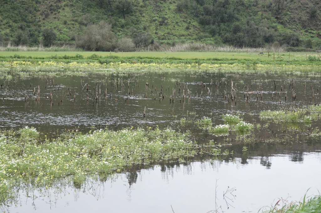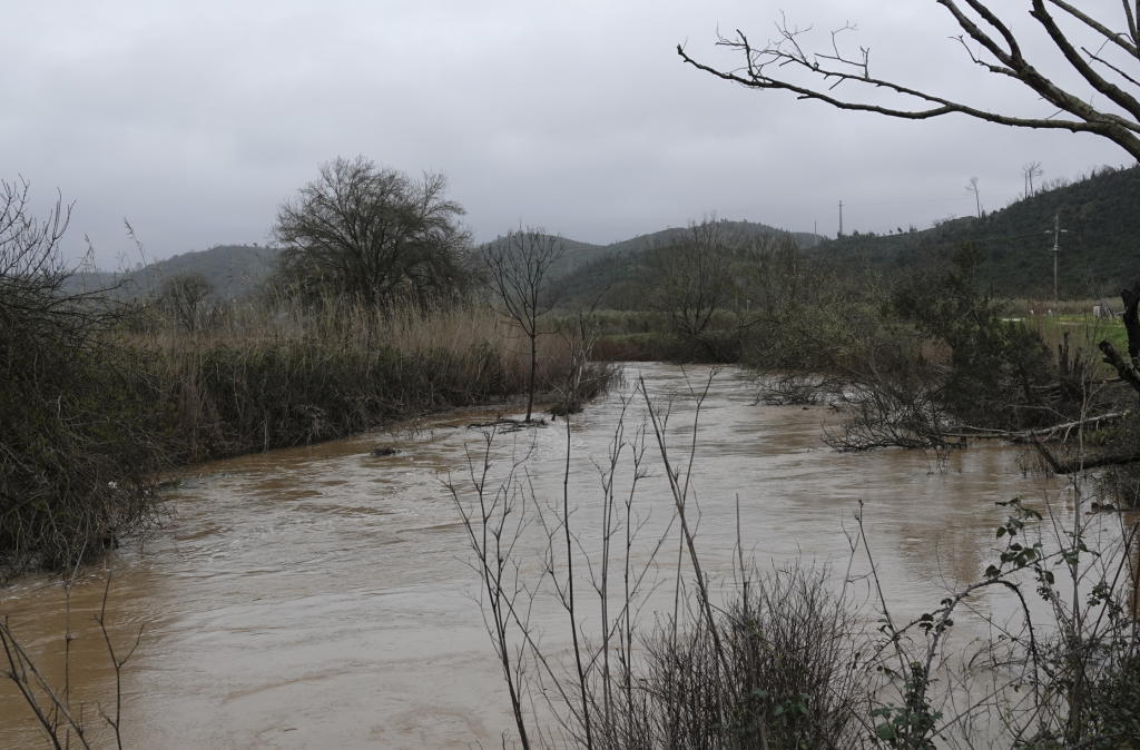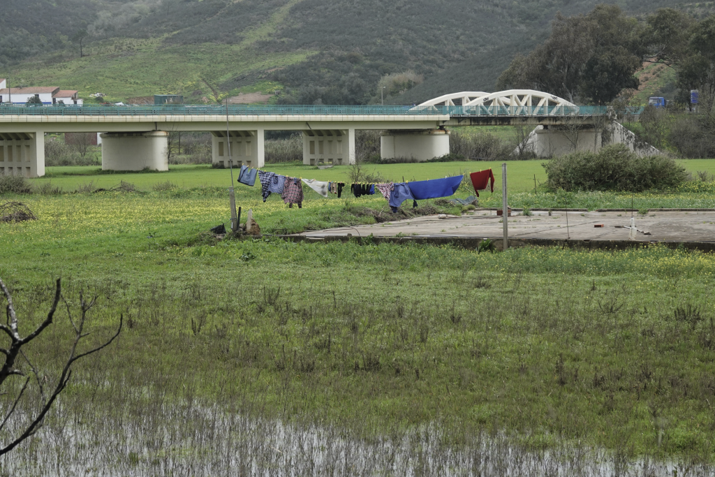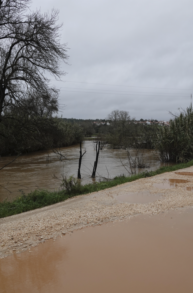 Vandaag eindelijk even een uurtje “droog”, dus … op pad. We willen kijken hoe het met het water bij Odeceixe is. Ook i.v.m. de terugreis die gepland moet worden. Daar aangekomen kijken we elkaar aan, dit klopt niet. Vorige keer stond het water bijna op de straat. Een heel brede rivier stroomde woest onder de brug. Nu moeten we zoeken naar het water, het lijkt wel een stroompje i.p.v. een rivier. Het huis dat eerst deels onder water stond staat nu droog. Ongeveer 10 meter bij het huis vandaan hangt de was te drogen.