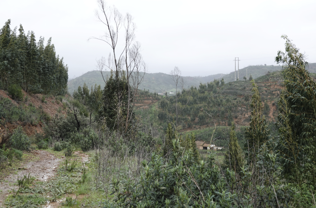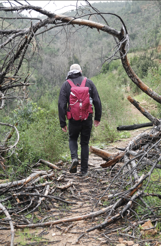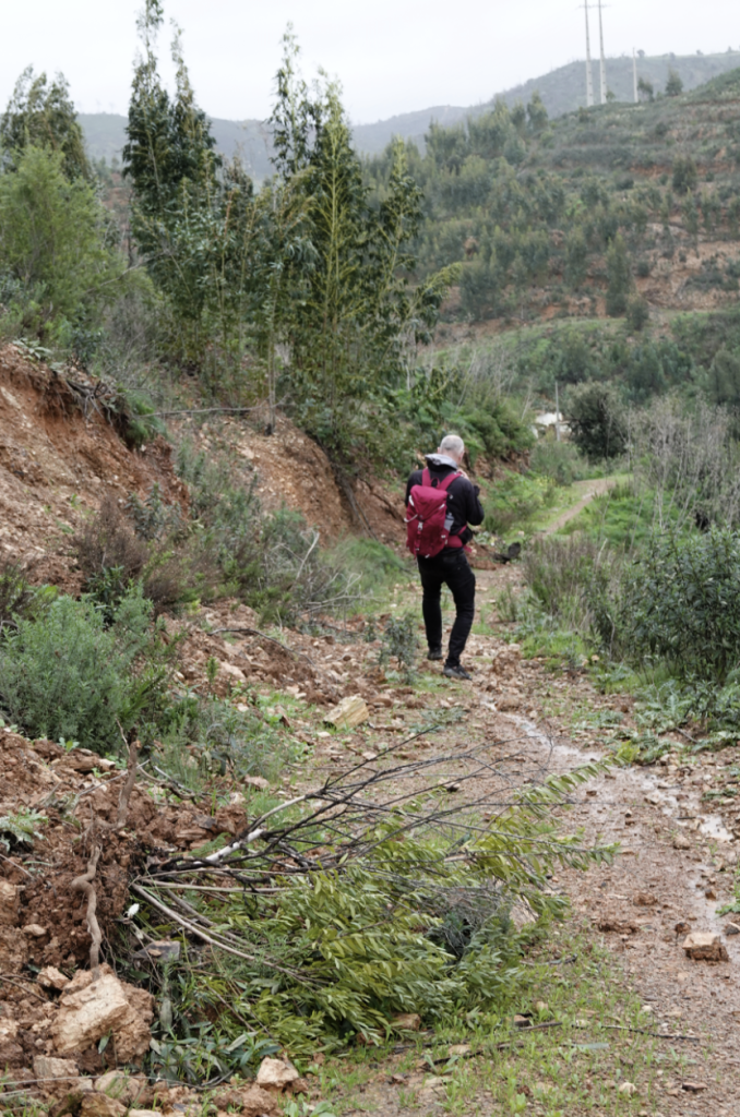 We lopen door langs de rivier, het is nog wel nat en blubberig, maar er staan alleen maar plassen. We gaan het bergpad op en schrikken daar van omgevallen bomen, zwartgeblakerde bomen, paden die ingestort zijn, stenen die het pad versperren etc. We klimmen en klauteren tot we op het pad een scheur zien. Het wordt te link, er is al veel weggegleden en wij willen daar niet bij horen. In de regen lopen we terug naar de auto.